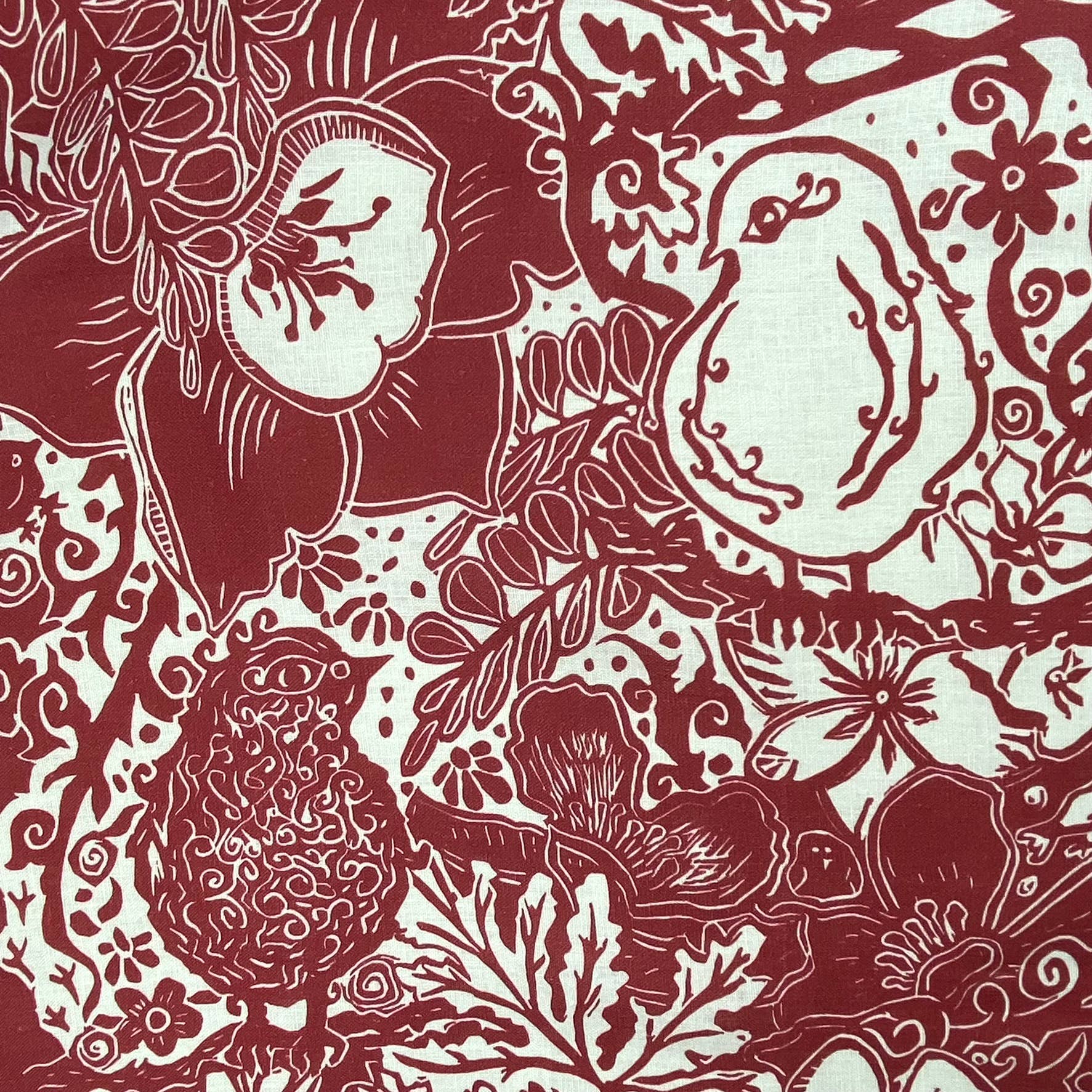 “The Invitation” showcases artist-designed whimsy from an original hand-carved linocut, telling a charming story of birds nestled within a floral setting. Both beautiful and functional, this piece adds personality and artistry to everyday moments.