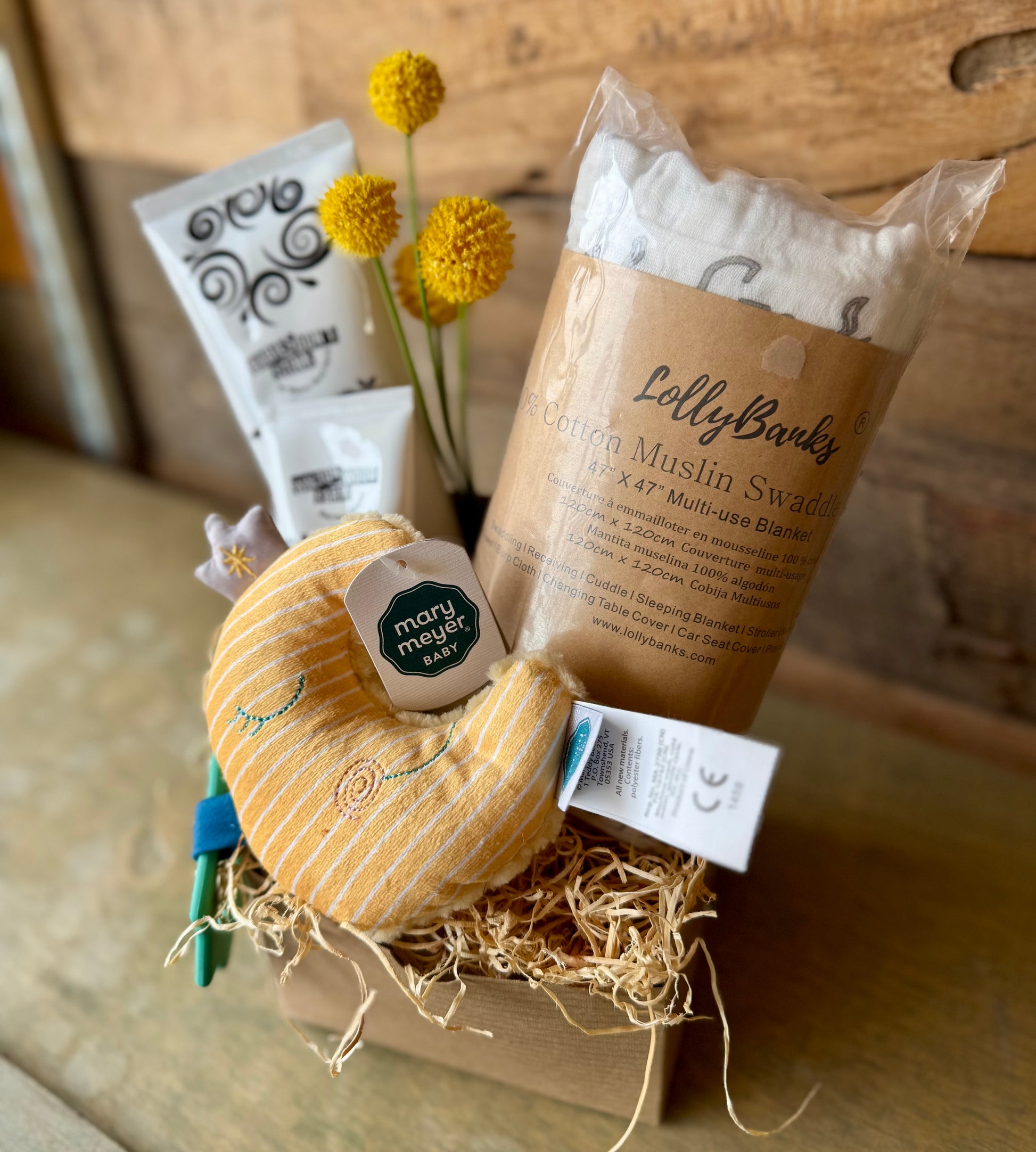 We hand-select a combination of cozy baby items, gentle bath products, soft textiles, and soothing self-care favorites, all tailored to your note and budget. Every box is made to feel personal, practical, and a little bit magical.