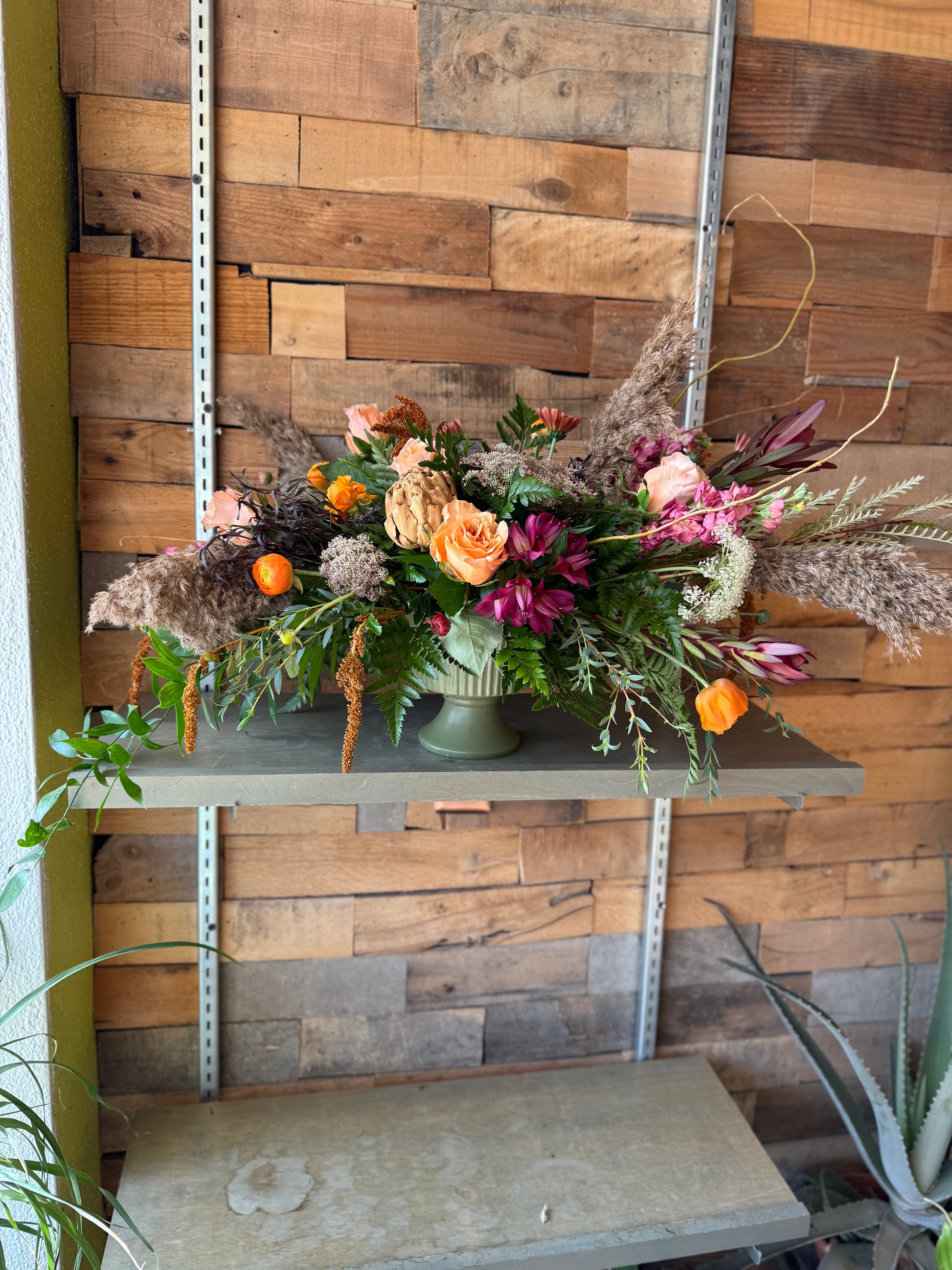 Arranged in a timeless pedestal vase, it’s the perfect centerpiece for a celebration, entryway, or gift that speaks volumes. With its mix of bold hues and delicate accents, this arrangement turns any space into a moment of joy.