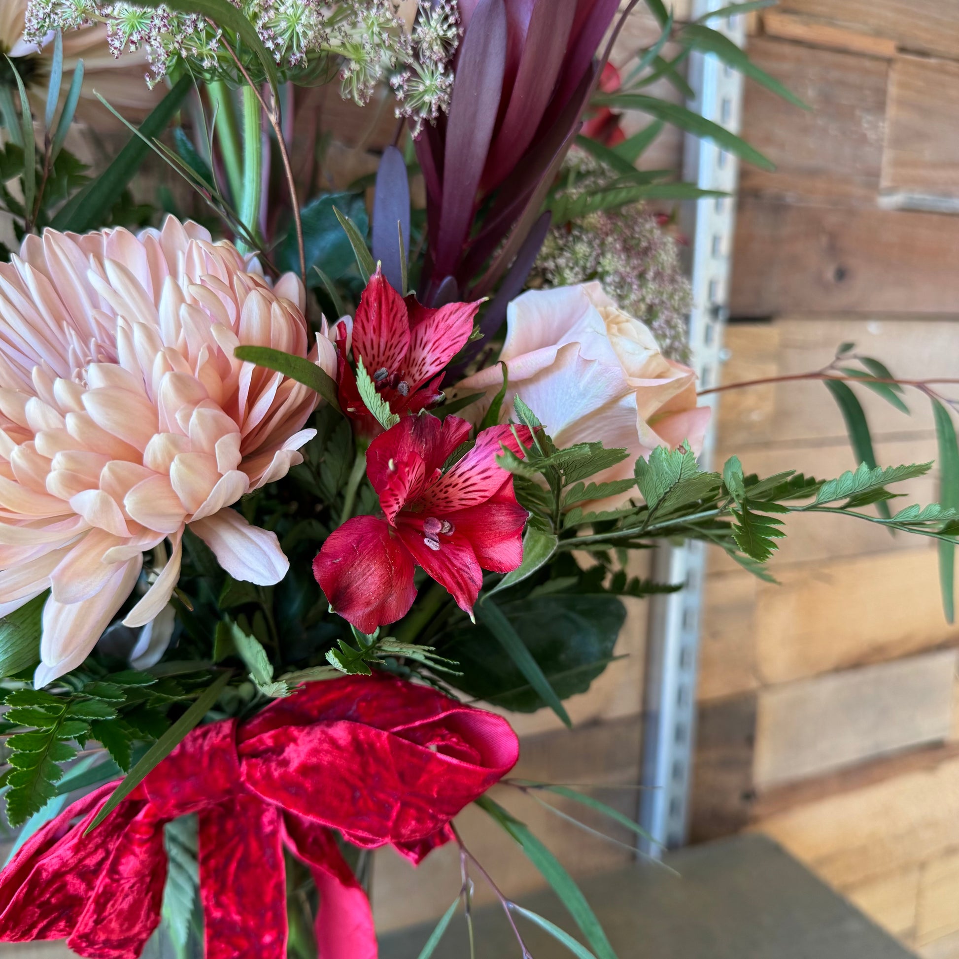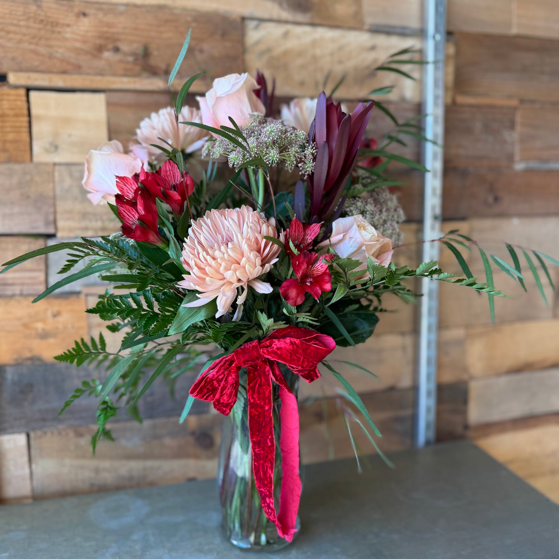 Every Sweet Heart arrangement is handcrafted using the freshest blooms of the season. While flower varieties may vary, the design will always highlight soft movement, feminine details, layered tones, and the signature curved shape that makes this piece so special.