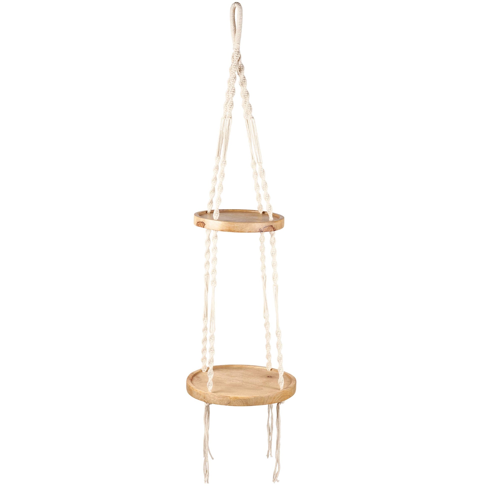 A plant hanger from our Botanical Collection made with cotton rope and natural wood in a simple design. Planter features two tiers to place potted plants on the round wooden shelves. Accessories and greenery pictured not included. Our Tiered Shelf plant hanger is easy to hang via tied loop. A natural plant accessory perfect for gifting to any plant parent.