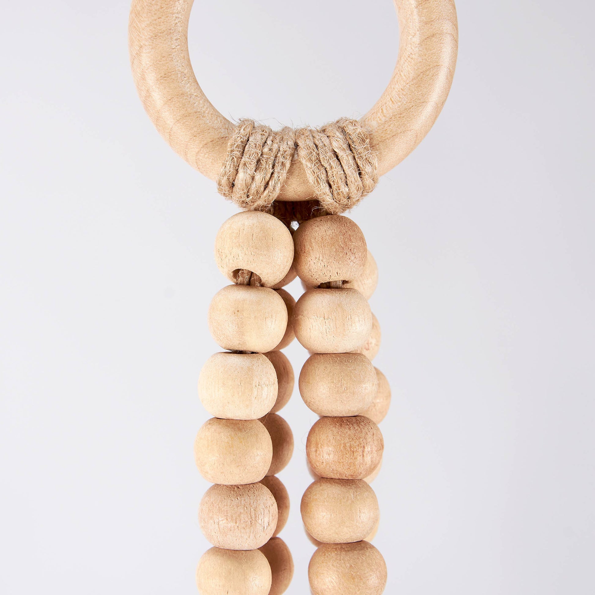 A plant hanger from our Plant Parent Collection featuring large and small wooden beads creating to a space to hold a potted plant with jute tassel underneath. Pot and plant pictured not included. Our wood bead plant hanger is easy to display via attached sturdy wooden ring. A natural plant accessory perfect to use as everyday home décor.